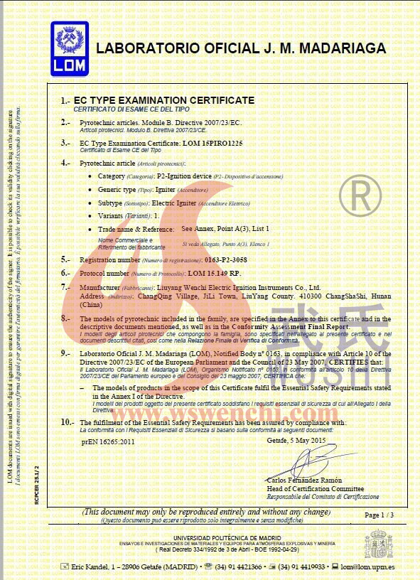 瀏陽(yáng)市文馳電點(diǎn)火具有限公司(原培文電子點(diǎn)火器材廠),創(chuàng)建于1998年,是一家專業(yè)從事研制銷售電子點(diǎn)火產(chǎn)品的民營(yíng)科技企業(yè),是我國(guó)第1枚煙花用電點(diǎn)火頭生產(chǎn)者,是《煙花爆竹電點(diǎn)火頭國(guó)標(biāo)》牽頭起草單位。公司位于中國(guó)“煙花之鄉(xiāng)”湖南省瀏陽(yáng)市,地理位置優(yōu)越,交通便利。    我公司研制的對(duì)象是用電能引燃火藥、做機(jī)械功等預(yù)定功能的一次性使用的元件或裝置,包括電點(diǎn)火頭(英文名ElectricMatch or Electric Igniter,中文俗稱“電火柴”或“電發(fā)火頭”)、電點(diǎn)火管和延期電點(diǎn)火管;我們估且在以后的產(chǎn)品技術(shù)欄中將我們研究的產(chǎn)品統(tǒng)稱為電點(diǎn)火具,將電點(diǎn)火器看成是用于提供和控制供給電點(diǎn)火元件點(diǎn)火的電能器材;我們研究的電點(diǎn)火橋路有橋絲式、無(wú)橋絲···